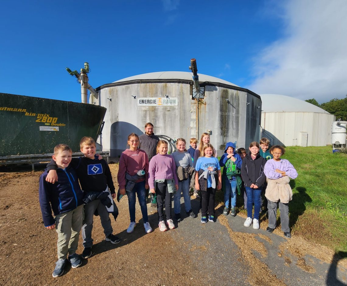 Im Rahmen des Sachunterrichtsthemas „Strom“ besuchten die Kinder der Klasse 4 gemeinsam mit Frau Grave den Bauernhof der Familie Kruse in Kampe. Die Schülerinnen und Schüler nahmen dabei die Biogasanlage ganz genau unter die Lupe und lernten, wie aus den verschiedenen Rohstoffen Strom erzeugt werden kann. Marc Kruse erklärte den Kindern die Abläufe vom Einfüllen der Rohstoffe, die in Biogas umgewandelt werden, bis zum Antrieb des Motors und des Generators, der schlussendlich Strom produziert. Die größte Freude hatten alle bei den Tieren des Bauernhofs: Bullen, Kühe und Kälber wurden bestaunt und gestreichelt. Für alle war es ein schöner und lehrreicher Tag. Ein großes Dankeschön geht an Familie Kruse, die den…