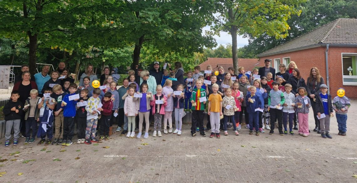 Bei strahlendem Sonnenschein warteten am Freitag 13 aufgeregte Erstklässler und Erstklässlerinnen mit ihren Familien vor der Kirche in Kampe. Für sie war es ein ganz besonderer Tag: Die Einschulung! Bei einem wundervoll gestalteten Gottesdienst begrüßte Frau Feuerhake die Kinder in der Gemeinde. Anschließend ging es für alle mit Gesang, bunt geschmückten Bögen und Sonnenblumen zur Grundschule. Dort nahmen die Erstklässler und Erstklässlerinnen gespannt und bestimmt auch etwas aufgeregt in der ersten Reihe Platz und genossen das Programm. Neben der herzlichen Begrüßgung von Frau Kreye stand wie immer viel Musik und ein tolles Theaterstück der 4. Klasse auf dem Programm. Das Stück erzählte von Nelly, die leider nicht lesen und schreiben…