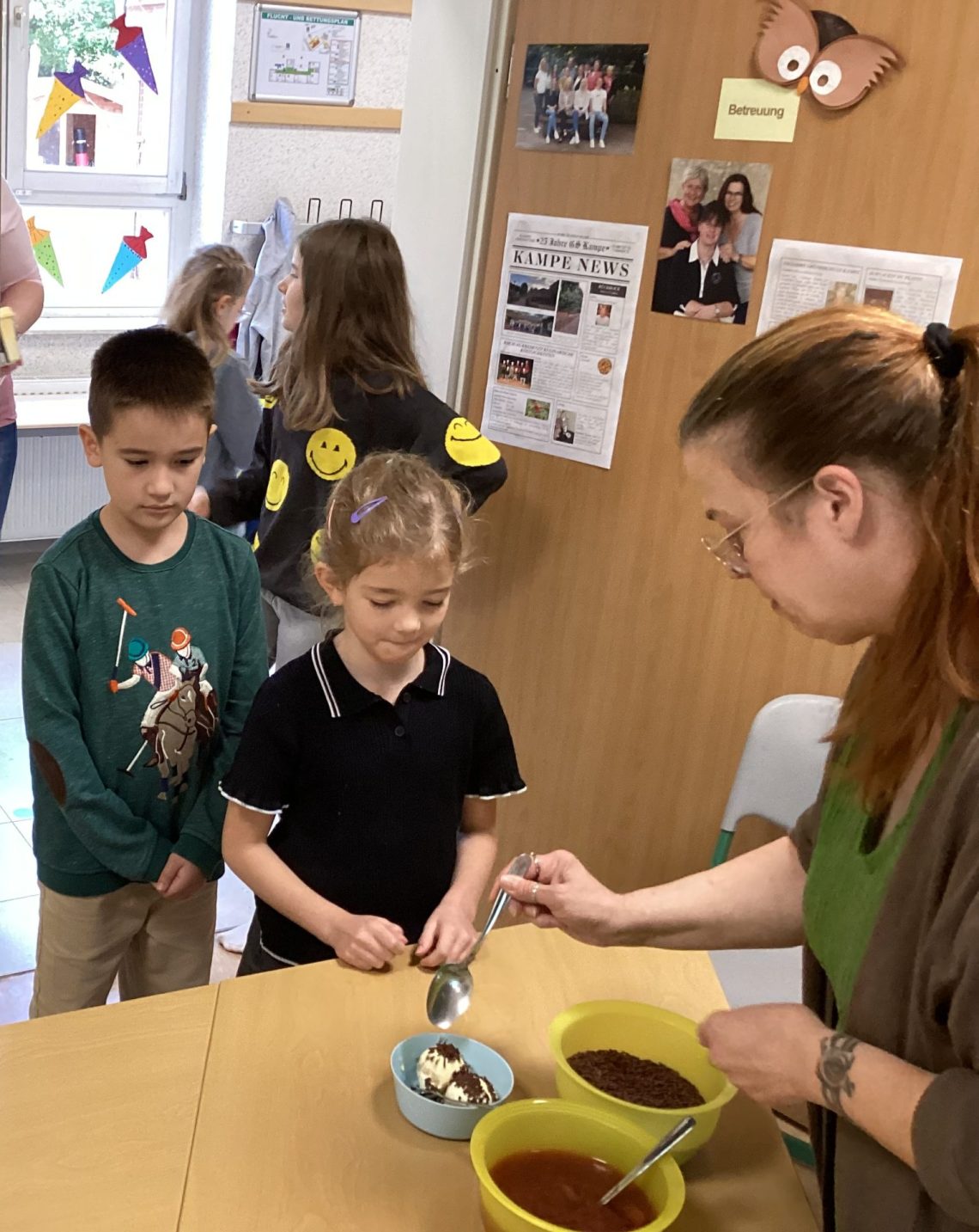 Wie auch in den vergangenen Jahren hatte der Förderverein der Grundschule Kampe zum Weltkindertag wieder etwas Tolles für alle Schülerinnen und Schüler vorbereitet. Ganz demokratisch konnten die Kinder im Vorfeld darüber abstimmen, was sie sich als Leckerei zum Weltkindertag wünschen. Die Entscheidung fiel vielen Kindern gar nicht so leicht. Am Ende erhielt das Eis die meisten Stimmen. Zum Wochenstart gab es dann für alle eine große Portion Vanilleeis mit Streuseln und Erdbeeren, die Gaby Löchte und Anne Marcussen an die Kinder verteilten. Ruckzuck wurde das Eis verputzt und die Schüsseln geleert. Das Lächeln auf den Gesichtern der Kinder zeigte, dass die Aktion des Fördervereins wie immer ein voller Erfolg war!