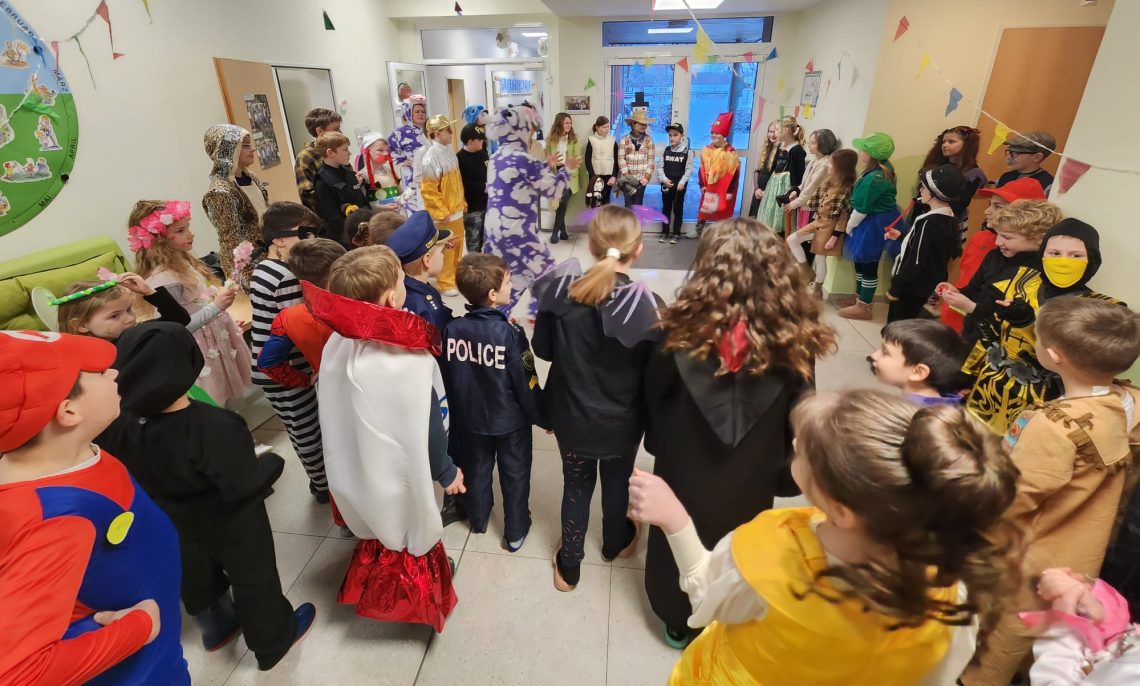 Am Rosenmontag verwandelte sich unsere Schule in ein fröhlich-buntes Narrenhaus. Überall sah man fantasievolle Kostüme: Ninjas, Prinzessinnen, Feen, Polizisten, Tiere und viele weitere kreative Verkleidungen sorgten schon am Morgen für ausgelassene Stimmung. Gestartet wurde mit einer lustigen Polonaise durch das gesamte Schulgebäude. Mit Musik und guter Laune zog eine lange Schlange aus kleinen und großen Jecken und Jeckinnen durch die Flure, das Lehrerzimmer und die Klassenräume. Anschließend wurde in den Klassen weitergefeiert. Bei verschiedenen lustigen Spielen hatten alle viel Spaß. Natürlich durfte auch ein leckeres Karnevalsfrühstück nicht fehlen. Ein ganz besonderes Erlebnis erwartete die Schülerinnen und Schüler im Begegnungshaus: Eine mitreißende Lesung mit Patricia Prawit, der bekannten Stimme von Ritter…