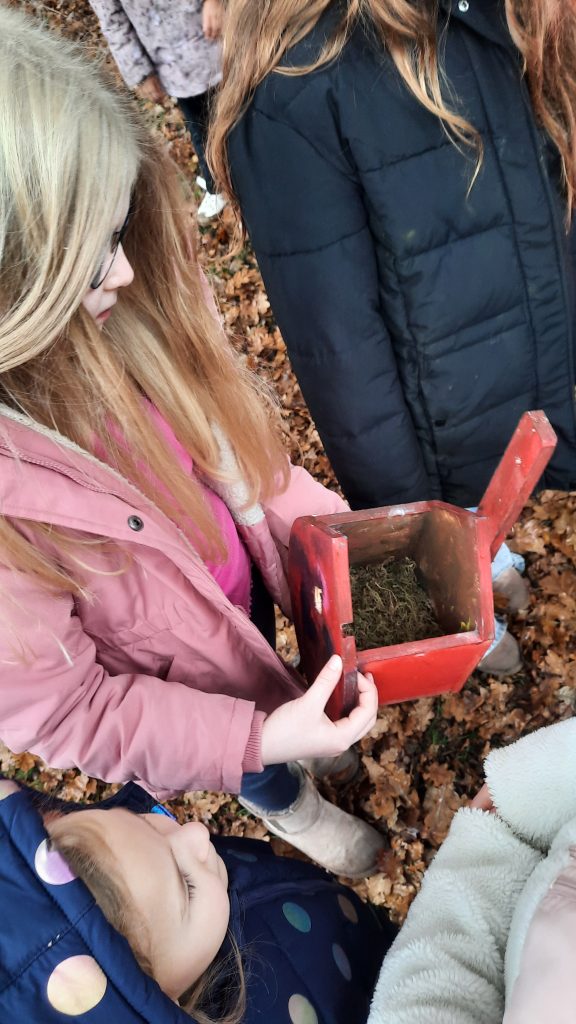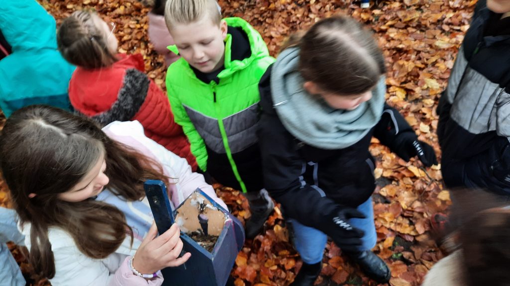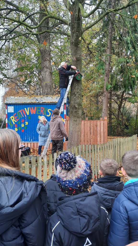 Mit großen Augen und voller Spannung verfolgten die Kinder, wie die Nistkästen abgenommen und sorgfältig kontrolliert wurden. Der erste Nistkasten war jedoch leer. Schnell schlussfolgerten die Schülerinnen und Schüler, dass es auf dem Schulhof für die Vögel einfach zu laut war und ein neuer Standort gefunden werden muss. Und tatsächlich: Ein Großteil der übrigen bunten Häuschen hatte kleine Bewohner gefunden!