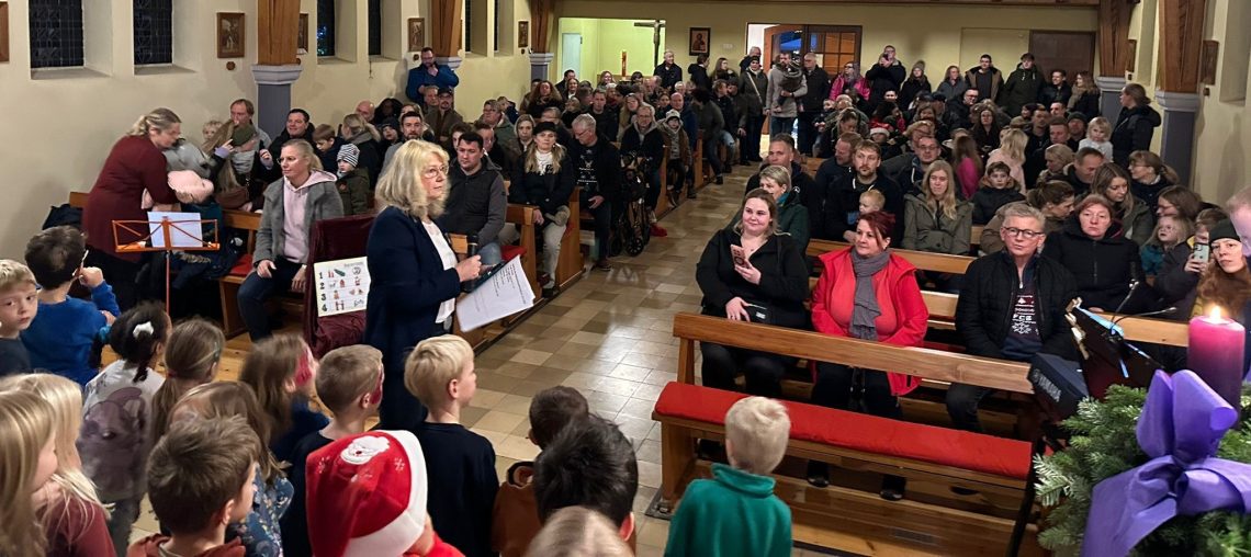 In der Kirche begrüßte Frau Kreye herzlich alle Zuhörerinnen und Zuhörer und las weihnachtliche Geschichten vor, die Groß und Klein auf die Adventszeit einstimmten. Im Anschluss daran präsentierten die Kinder der Grundschule Kampe unter der Leitung von Herrn Kollenbach ein kleines musikalisches Programm. Mit ihren Weihnachtsliedern sorgten sie für leuchtende Augen und viel Applaus.