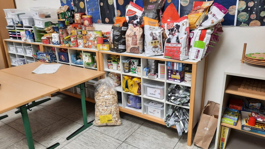 Parallel dazu sammelten die Viertklässler und Viertklässlerinnen Spenden für einen wohltätigen Zweck. Es kamen viele haltbare Lebensmittel und Tierfutter zusammen, die an die Tafel und das örtliche Tierheim übergeben werden.
