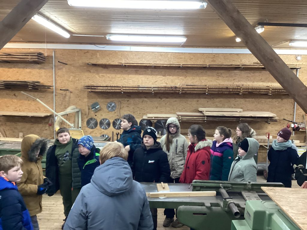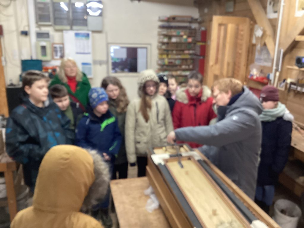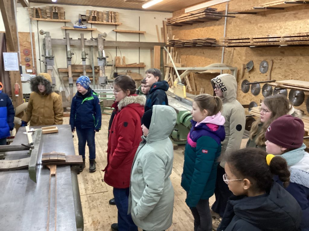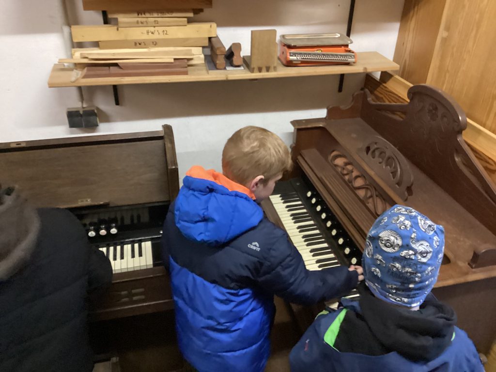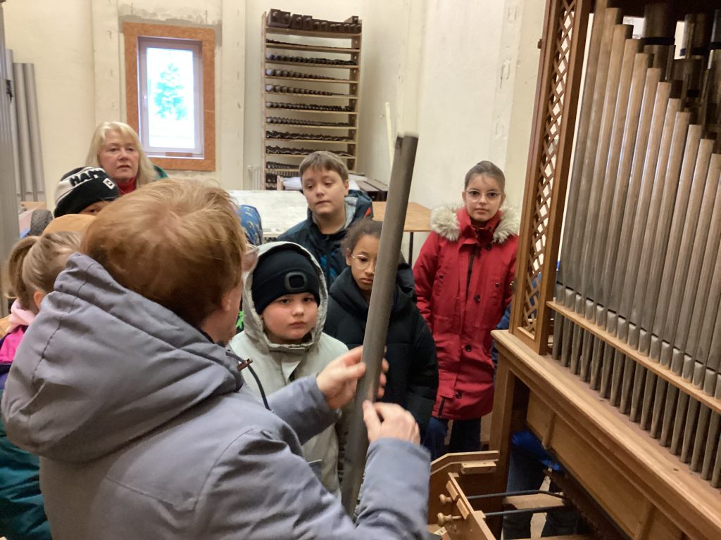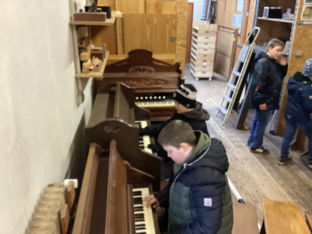 Herr Schomberg führte die Klasse durch seine Werkstatt und erklärte anschaulich, welche Arbeitsschritte und Maschinen beim Bau einer Orgel zum Einsatz kommen. Dabei konnten die Kinder mehrere Orgeln in unterschiedlichen Größen bestaunen, die in der Werkstatt restauriert werden.