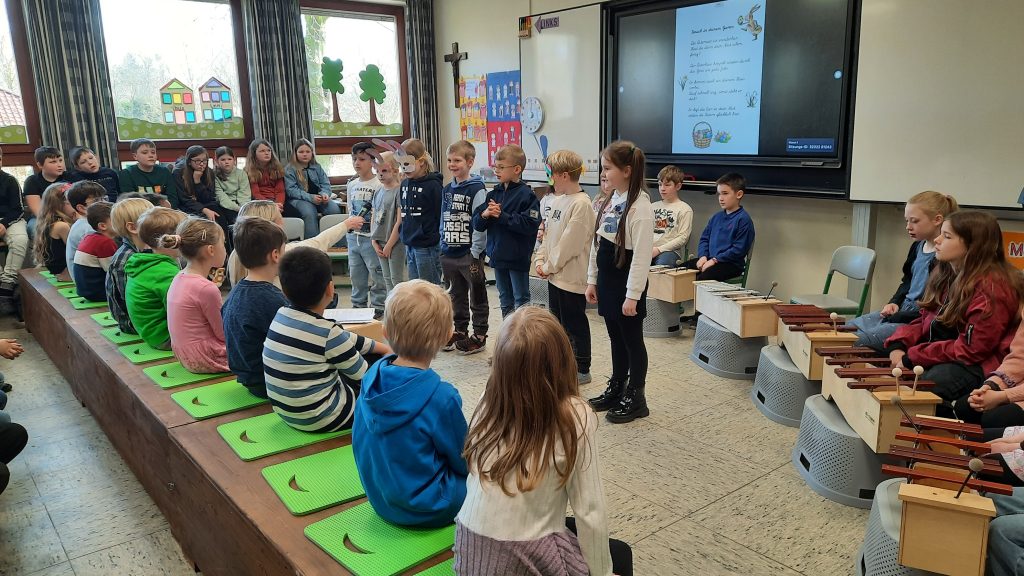 Auf dem bunten Programm standen neben Gedichten auf Deutsch, Englisch, Plattdeutsch und Saterfriesisch auch Tänze, ein Osterätsel, ein Sketch und natürlich wieder viel Musik. Gemeinsam sangen die Kinder zahlreiche Frühlings- und Osterlieder. Außerdem zeigten Enni Weßels (Klasse 3), Lea Elberfeld und Tristan Ulpts (beide Klasse 4) ihr können am Klavier. Matilda Frerichs (Klasse 3) beeindruckte mit einem Flötenstück.